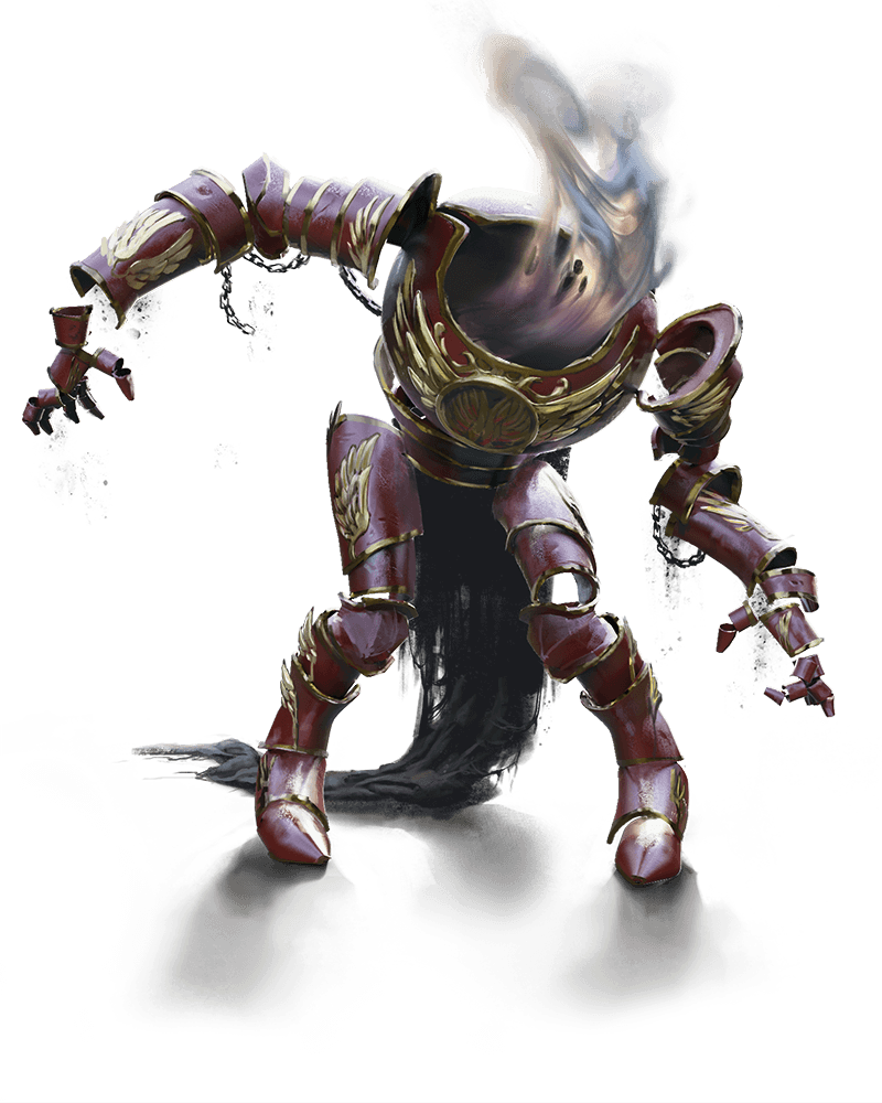 Armor given life by a witch's magic. Powerful and without thought or fear. To some a perfect simple warrior, it feels no pain or regret. Hesitation or reluctance to follow its orders. Only able to follow simple orders, the armor will see such through to completion or destruction at all costs.